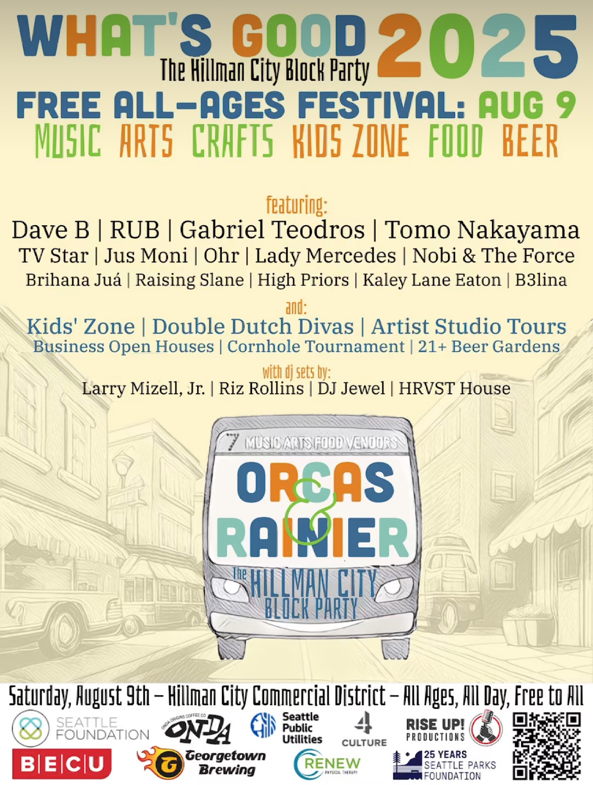 "What's Good" Hillman City Block Party, August 9: The Hillman City Neighborhood Association and local businesses are bringing back the block party of the summer, with multiple stages of live music, plus late-night performances at Black & Tan Hall and food, drinks, & activities for all ages. This is a volunteer-led event -- if you're interested in helping to make this incredible event happen, please sign up for a volunteer shift. Don't miss it!